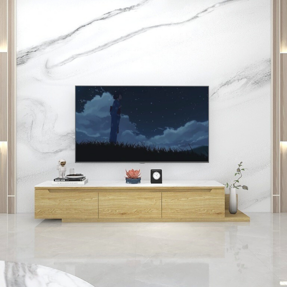 The console is topped with a premium sintered stone surface, known for its durability and resistance to heat, scratches, and stains. Its refined finish offers both aesthetic appeal and practicality for daily use.