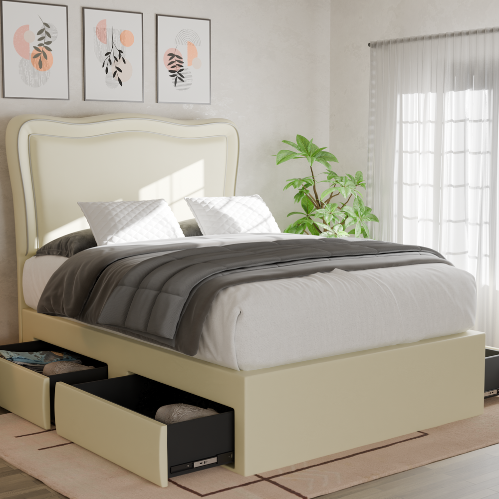 The Freyla Faux Leather Drawer Bed Frame is where elegance meets practicality. Wrapped in sleek, premium faux leather, it features a refined design and discreet built-in drawers for convenient storage. Durable and stylish, this bed frame is a perfect addition to a well-organized and polished bedroom.