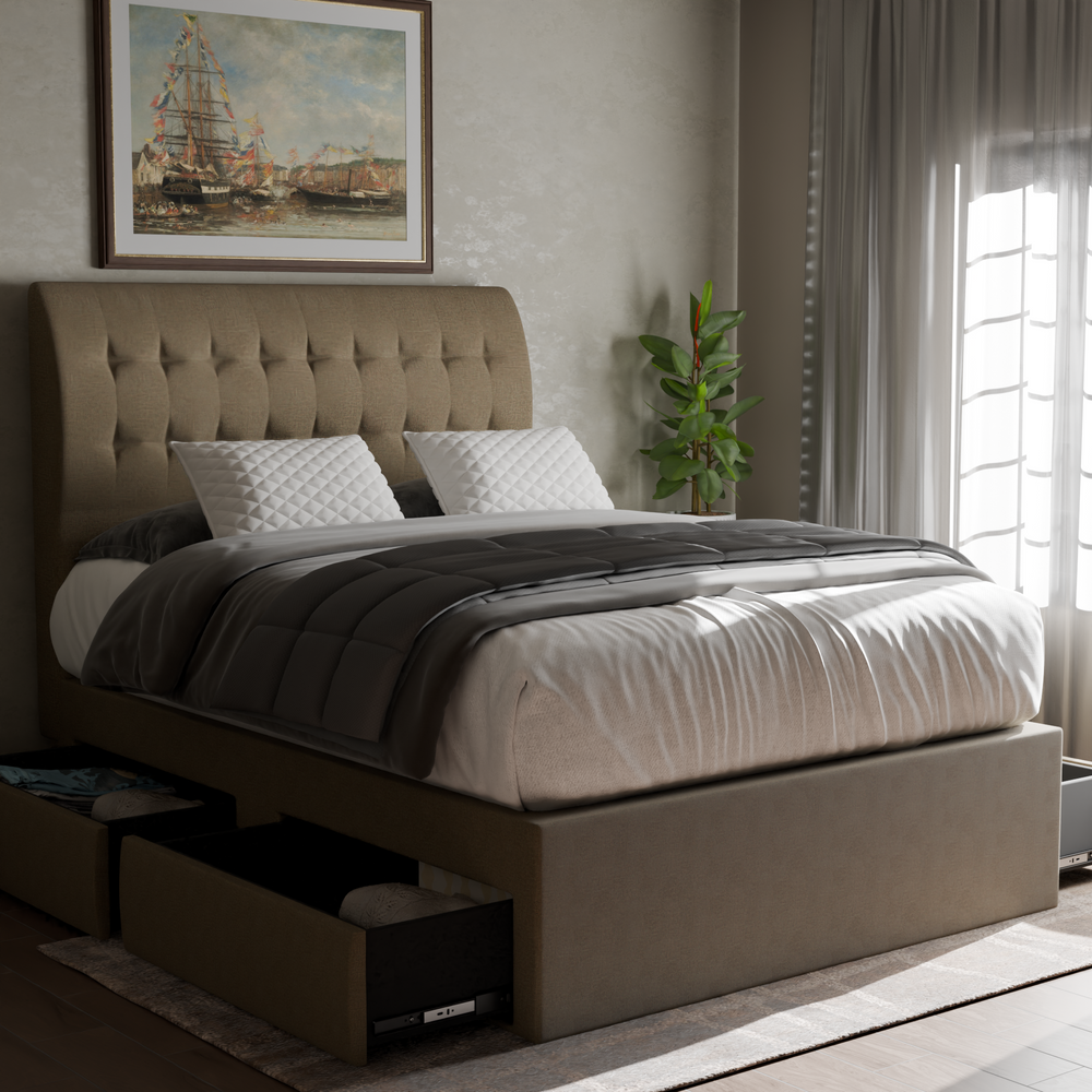 Style meets practicality with the Orlando Fabric Drawer Bed Frame. Wrapped in premium, soft fabric, it features a sleek and modern design while offering discreet built-in drawers for added storage. Keep your essentials organized and your bedroom clutter-free without sacrificing comfort or style.